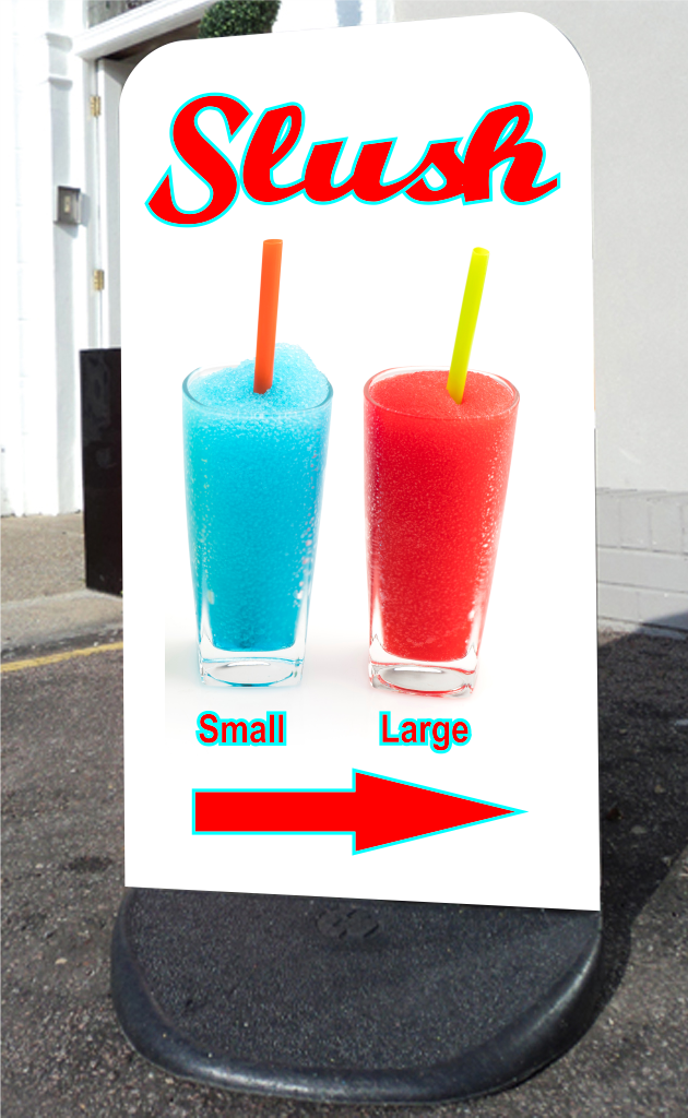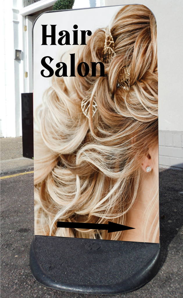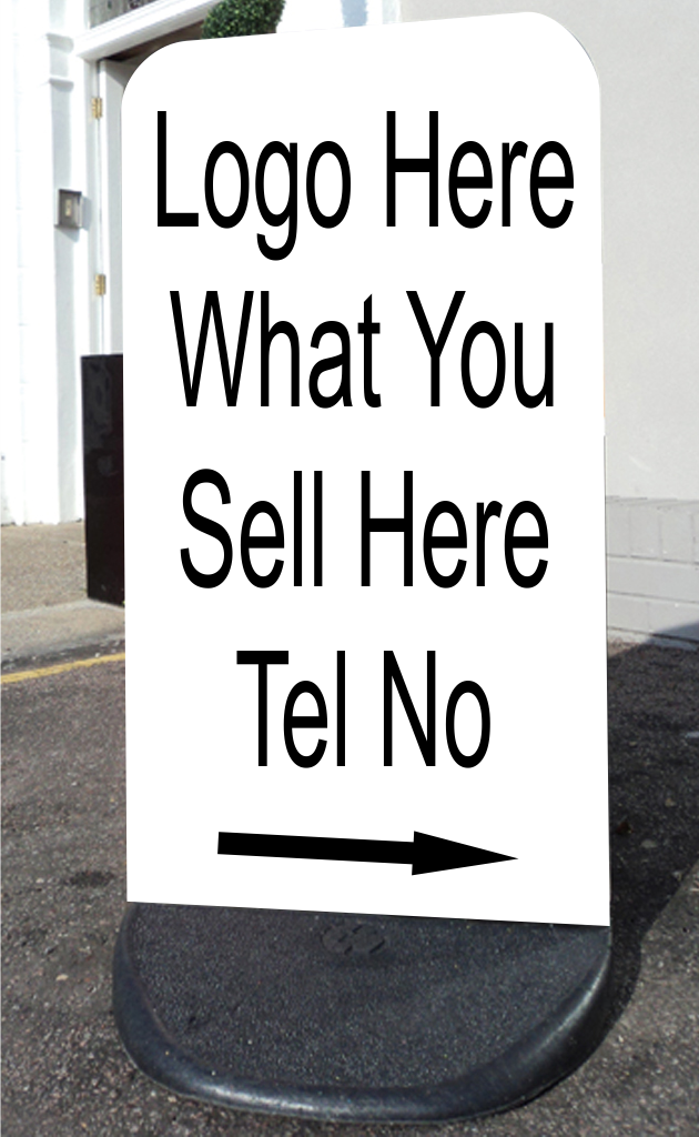 This pavement sign will create more customers for your business. It will stand out, tell customers what you do and encourage them in. Colours can be changed to suit your business – fill in your details on the checkout page under “add a note to your order”. Easy to put together out of the box and with the heavy recycled base it stays put in the wind. No need to keep fetching it back from up or down the road and it won’t blow over or injure passers by either. You can also drill a hole in the board or the base to chain it up, stopping theft.